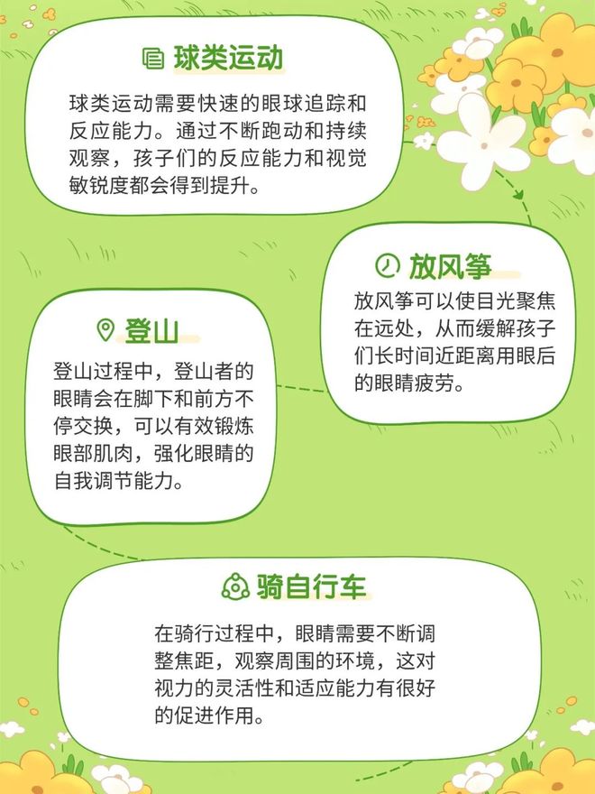 在户外运动时,眼睛可以注视远处的景物,这有助于缓解长时间盯着近处物体(如电脑屏幕、书本等)所带来的眼睛疲劳。此外,参与球类等户外运动时,眼睛需要不断追踪运动